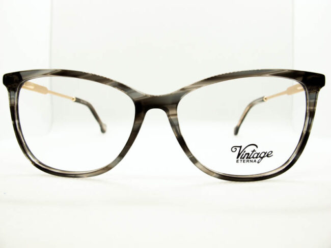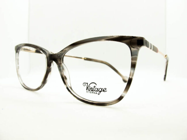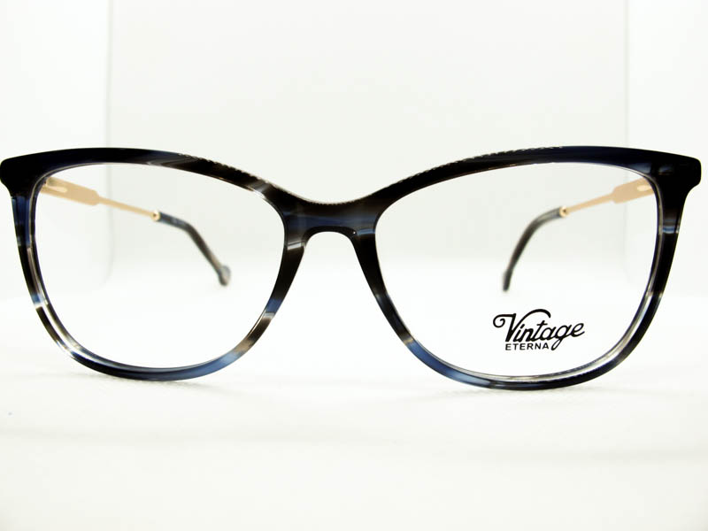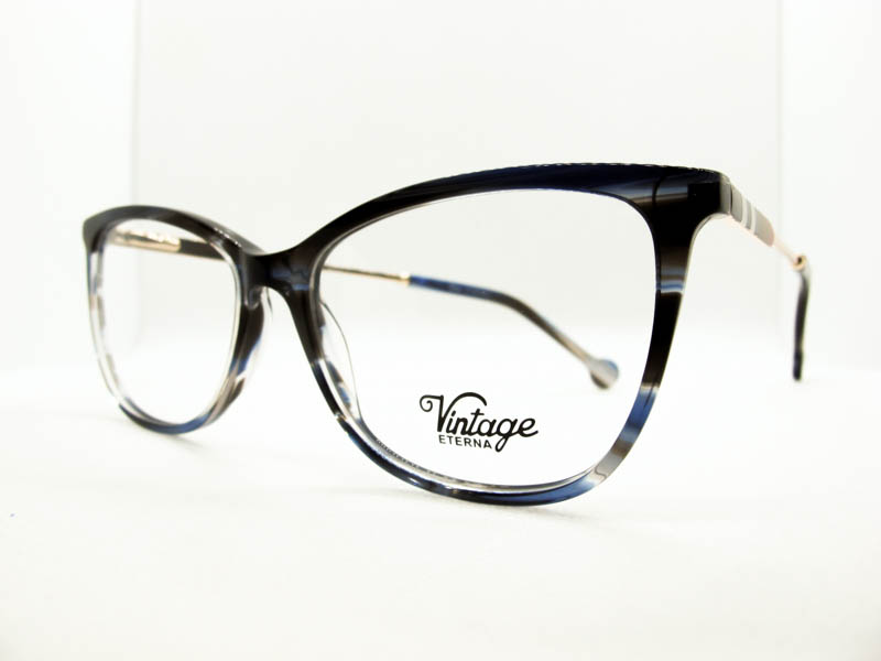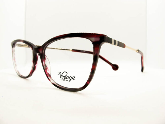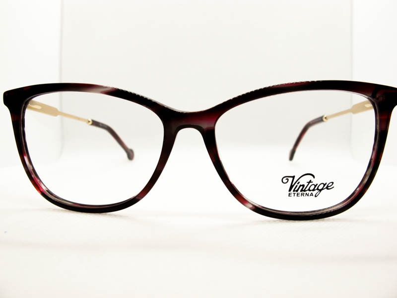 Armazon de acetato liviano estilo vintage para dama. Patillas flex de metal.