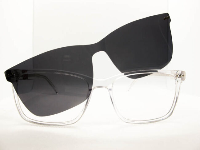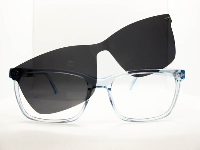 Linea de anteojos recetado con clip on. Ideal para personas que buscan un anteojo para sol graduado. Armazon de acetato y patillas con flex.