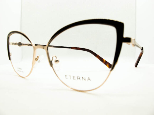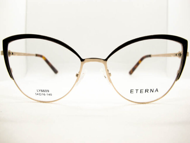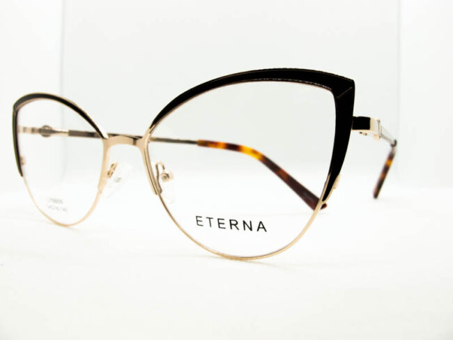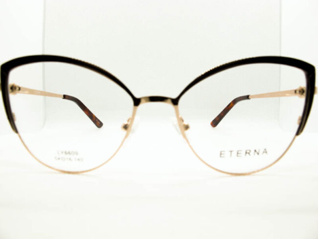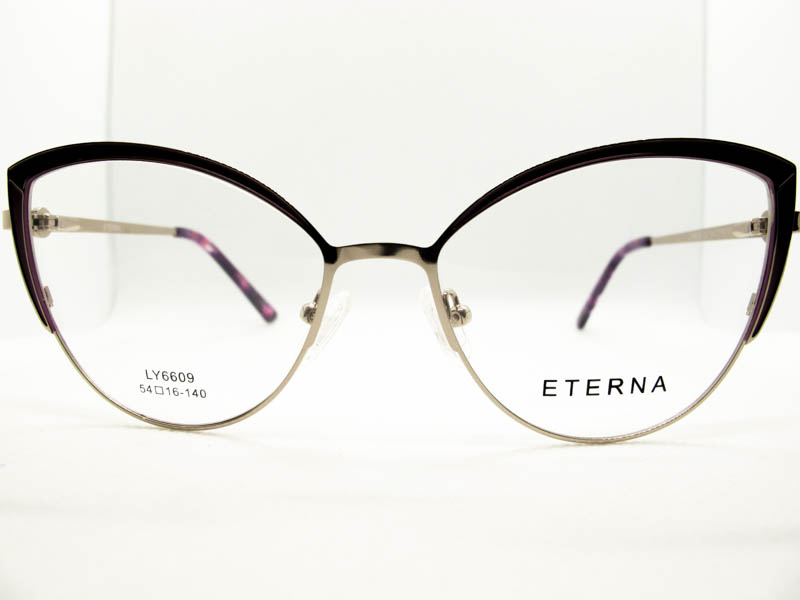 Armazon de metal estilo gatito para dama con detalles de colores en el frente y patillas. Sistema de patilla con flex.